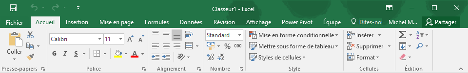 Les onglets par défaut ont pour nom Fichier, Accueil, Insertion, Mise en page, Formules, Données, Révision, Affichage et Équipe.