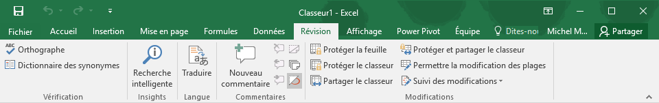 L'onglet Révision est utilisé dans le cadre d'un travail en équipe. Il donne accès à des outils de vérification, permet d’ajouter des commentaires, de limiter l’accès à certaines cellules et bien d’autres choses encore.