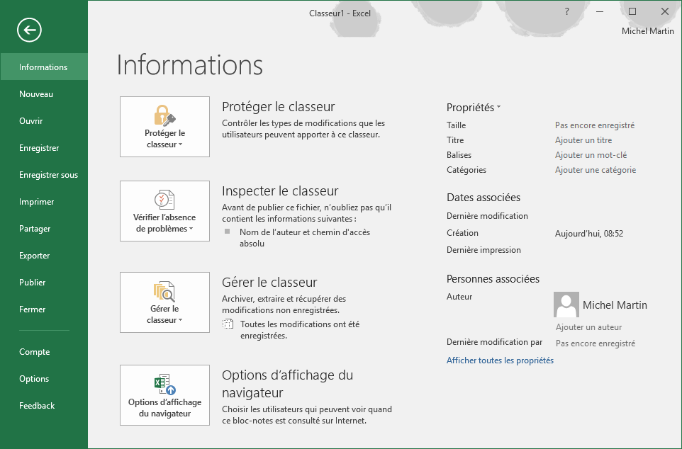 La commande Informations donne accès à des informations sur le classeur. Vous l’utiliserez pour :