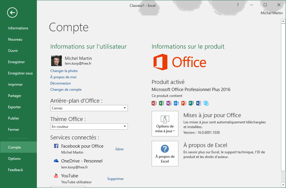 L'onglet Fichier donne accès à un menu qui occupe toute la fenêtre d'Excel. Ce menu est appelé vue Backstage. Il rassemble des fonctionnalités telles que l’ouverture, la fermeture, la sauvegarde, l’impression et le partage du classeur en cours d’édition.