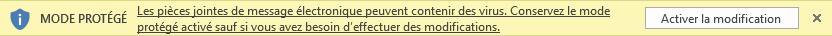 Lorsque vous ouvrez un tel classeur, un bandeau de couleur jaune vous signale le risque potentiel encouru. Dans ce mode, vous pouvez lire, mais pas modifier le classeur. Si vous êtes sûr(e) que le classeur est sans danger, cliquez sur Activer la modification, dans la partie droite du bandeau MODE PROTÉGÉ.