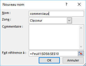 Pour atteindre cette plage de cellules, il vous suffit désormais de taper commerciaux dans la zone Nom (à gauche de la barre de formule) et d’appuyer sur la touche Entrée.