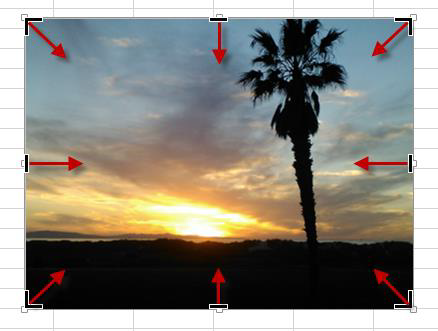 Cliquez sur l'image pour la sélectionner. Huit poignées de redimensionnement entourent l'image. Pointez-cliquez-glissez l'une d'entre elles pour obtenir le redimensionnement souhaité.