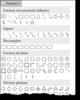Pour insérer des formes prédéfinies (rectangles, ovales, flèches, étoiles, diagrammes de flux, etc.) dans une feuille de calcul, sélectionnez l'onglet Insertion dans le ruban, cliquez sur l'icône Formes dans le groupe Illustrations et choisissez l'une des formes disponibles dans le menu.