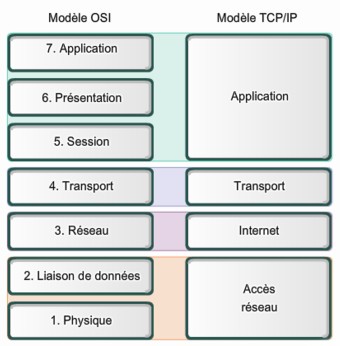 La pile TCP/IP est le plus souvent représentée sous forme d’un empilement de quatre couches que l’on superpose au modèle OSI (Open Systems Interconnection) conçu par l’ISO International Standards Organization) à sept couches et à la base des autres systèmes de réseau :