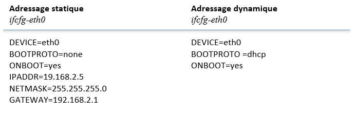 Les fichiers de configuration ifcfg*, du répertoire /etc/sysconfig/network-scripts contiennent le paramétrage des différentes interfaces réseau et peuvent être soit statique (adresse fixe), soit dynamique (utilisation d’un serveur DHCP) :