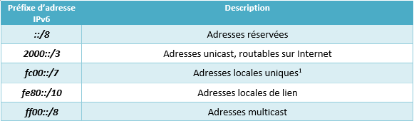 Cela signifie que les adresses sont uniques dans le monde, et peuvent être utilisées pour communiquer avec d’autres adresses également globalement uniques, ou avec des adresses locales de lien, pour des liens, bien évidemment, directement connectés.