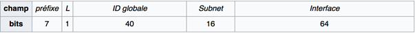 NOTE : Le 8ème bit est actuellement fixé à 1, ainsi cela donne le préfixe de plage d’adresses fd00::/8, permettant d’assigner cette plage d’adresses à un usage local. Cette adresse comprend alors un préfixe pseudo-aléatoire de 40bits afin d’éviter les conflits, lors de l’interconnexion à d’autres réseaux privés.
