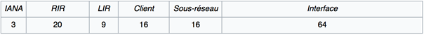 REMARQUE : Les RIR peuvent alors décider de subdiviser leur bloc /23 en 512 blocs de /32 (soit un par fournisseur). Puis, ce dernier peut aussi assigner 65536 blocs /48 à ses clients, qui disposent à ce stade de 65536 réseaux /64.