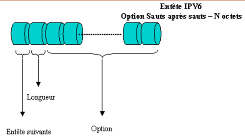 On peut avoir affaire à une entête dite pas-à-pas (aussi appelée hop-by-hop), contenant des informations destinées aux routeurs rencontrés sur le parcours du datagramme. La structure générale de ce genre d’entête est la suivante :