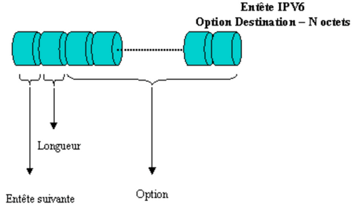 L’entête Option de destination s’utilise pour des champs qui n’ont besoin d’être interprétés et compris que du seul hôte destinataire. Dans la version originale du protocole IPv6, la seule option de destination ayant été définie, est l’option nulle. Cela permet de compléter cette entête avec des zéros et obtenir alors un multiple de 8 octets.