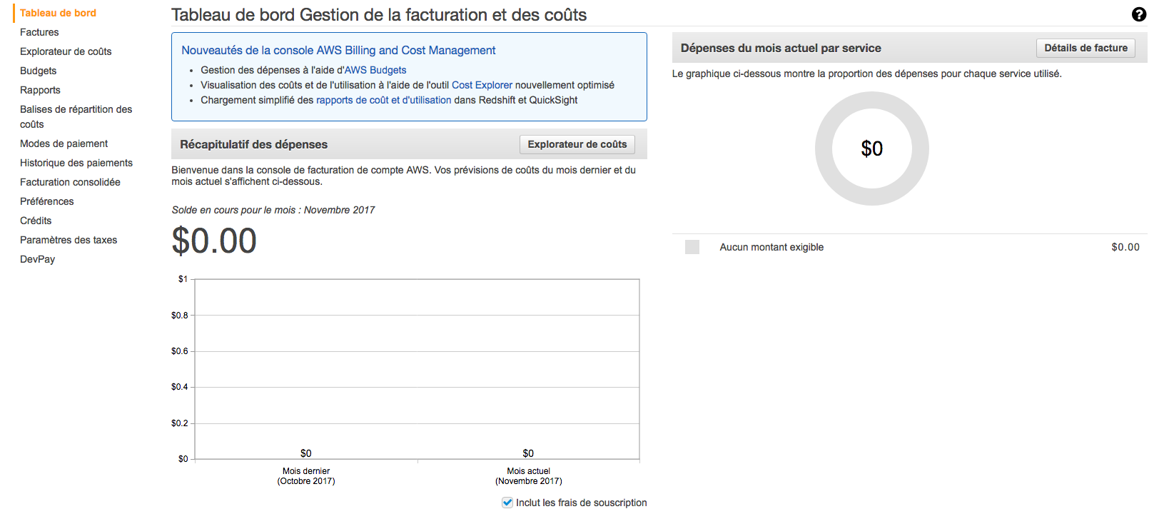 Si vous voyez cette section dépasser les 0$, cela signifie que vous allez devoir payer à la fin du mois. Normalement, ça ne devrait pas arriver si vous respectez l'usage gratuit d'AWS.