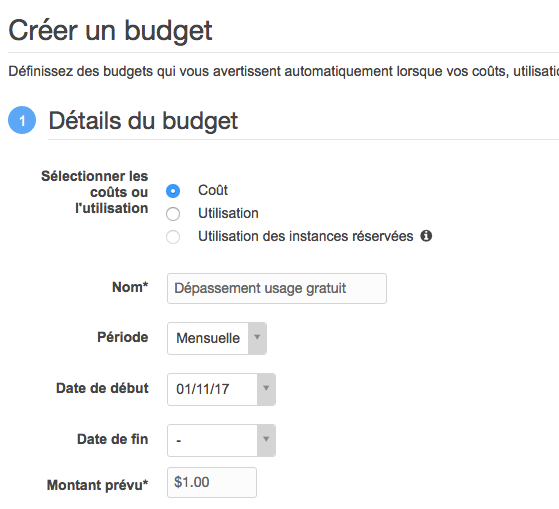 Si vous indiquez le "Coût prévisionnel" au lieu du "Coût actuel", alors AWS vous avertira dès qu'il estime que vous risquez d'atteindre 1$ de coût à la fin du mois. C'est un bon moyen d'être averti encore plus tôt.