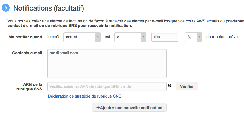 Ici, je propose qu'on m'envoie un email (à l'adresse que j'ai indiquée) si le coût actuel dépasse 100% du budget... c'est-à-dire s'il dépasse 1$.