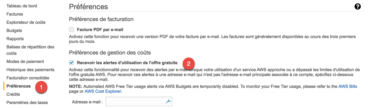 Il existe une autre solution encore plus simple pour être averti dès qu'on dépasse l'usage gratuit. Dans le "Tableau de bord Ma facturation", section "Préférences", cochez "Recevoir les alertes d'utilisation de l'offre gratuite".