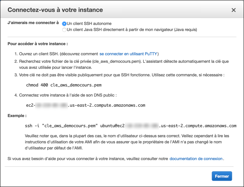 Il existe aussi un assistant de connexion qui vous donne directement la commande à taper pour vous connecter au serveur en SSH. Vous trouverez dans la documentation officielle des informations complémentaires pour la connexion. Depuis la liste des instances, cliquez sur le bouton "Connexion" pour afficher l'assistant :