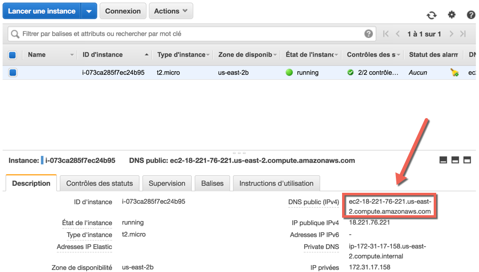 L'adresse de votre serveur peut être trouvée dans l'interface EC2 :