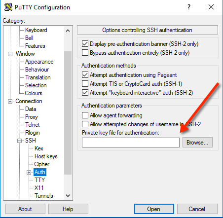 Précisez où se trouve le fichier de clé que vous aviez téléchargé, afin que le serveur vous autorise à vous connecter. Il faut aller pour ça dans Connection > SSH > Auth :