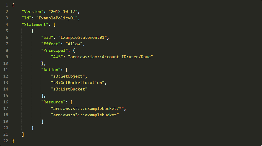 Cette policy autorise l'utilisateur Dave (créé sur AWS IAM) à lire un objet, connaître la localisation d'un bucket et à lister le contenu du bucket. Si vous vous demandez comment je connais la signification des actions, c'est parce que j'ai lu la doc, moi 😛). Les ressources qui sont affectées sont examplebucket et tous ses fichiers à l'intérieur.
