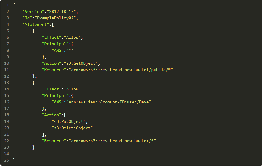 Cette policy donne aussi d'autres autorisations (vous pouvez voir qu'il y a 2 statements). Elle dit que Dave peut ajouter et supprimer des fichiers partout dans ce bucket.
