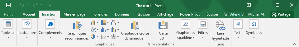 L'onglet Insertion permet d'insérer différents éléments dans un classeur :