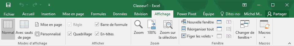 Enfin, l'onglet Affichage permet de choisir le mode d'affichage du classeur, d'afficher ou de cacher la barre de formules, le quadrillage et les en-têtes, de choisir un niveau de zoom et de gérer les fenêtres ouvertes.