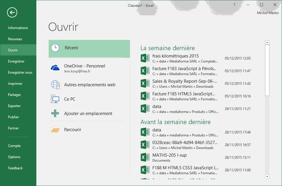 La commande Ouvrir permet d'ouvrir un classeur existant. Elle liste les classeurs utilisés récemment, et permet également d'ouvrir un autre classeur, en inspectant ses mémoires de masse, votre espace OneDrive ou une page Web. Les utilisateurs des anciennes versions d'Excel préfèreront peut-être utiliser la boîte de dialogue Ouvrir. Le cas échéant, appuyez sur Ctrl + F12 pour afficher la boîte de dialogue Ouvrir en court-circuitant la vue Backstage.