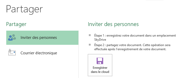 La commande Imprimer permet de définir les paramètres d'impression et d'imprimer le classeur en cours. La commande Partager est utilisée pour partager votre classeur par e-mail ou via OneDrive.