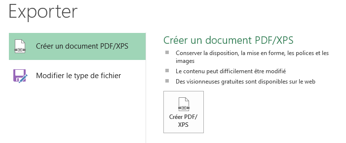 La commande Exporter permet de sauvegarder le classeur au format PDF ou XPS ou de l'exporter dans un des autres formats de fichiers supportés par Excel.