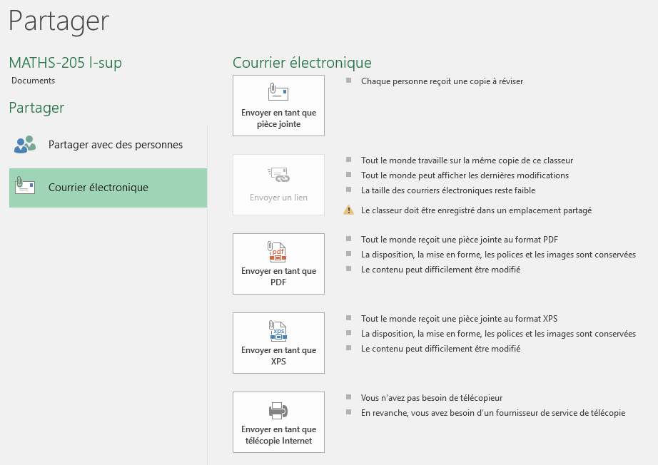 Pour envoyer le classeur dans un e-mail, sélectionnez l'onglet Fichier dans le ruban et cliquez sur Partager. Sélectionnez Courrier électronique sous Partager. Vous pouvez envoyer le classeur par email, en tant que pièce jointe, en tant qu'un simple lien s'il a été stocké dans un emplacement partagé, sous la forme d'un document PDF ou XPS, ou en tant que télécopie Internet. Cette dernière option nécessite un fournisseur d'un service de télécopie.