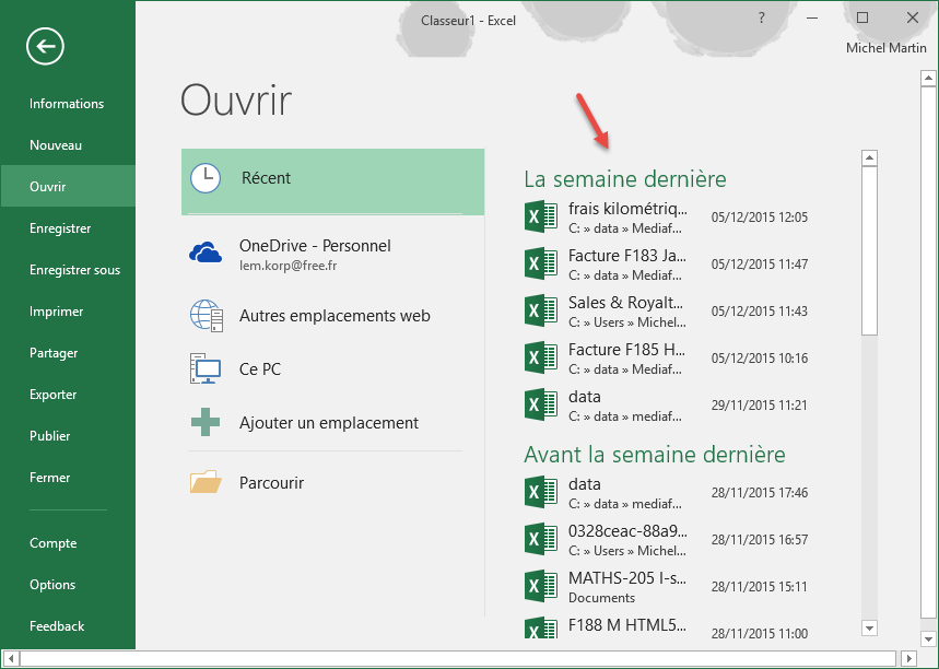 Pour rouvrir un classeur ouvert récemment, il n'y a rien de plus simple : sélectionnez l'onglet Fichier dans le ruban, puis cliquez sur Ouvrir. Les classeurs ouverts récemment sont listés dans la partie droite de la vue Backstage. Il vous suffit de double-cliquer sur l'un d'entre eux pour l'ouvrir.