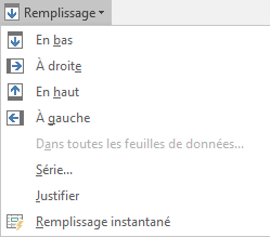 Pour copier une cellule dans plusieurs cellules adjacentes, sélectionnez la cellule source et les cellules destination, basculez sur l'onglet Accueil du ruban, cliquez sur l'icône Remplissage dans le groupe Edition et choisissez une commande dans le menu.