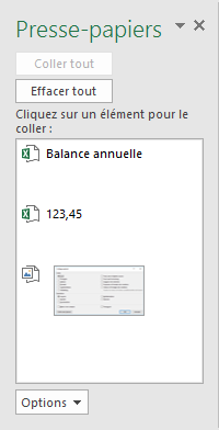 Les applications de la suite Office 2016 ont accès à un presse-papiers multiple contenant 24 entrées. Il est donc possible de couper ou de copier jusqu'à 24 éléments différents et de les coller comme bon vous semble dans vos classeurs. Pour accéder à cette fonctionnalité, vous devez afficher le volet Presse-papiers en cliquant sur son lanceur de boîte de dialogue.