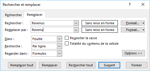 Tapez le texte à rechercher dans la zone Rechercher et le texte de remplacement dans la zone Remplacer par.