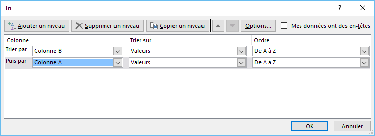 Lorsque vous cliquez sur la commande Tri personnalisé, la boîte de dialogue Tri est affichée. Déroulez la liste déroulante Trier par et définissez la colonne à trier (ici, la colonne B). Le tri se fera par ordre alphabétique sur les valeurs des cellules. Cliquez sur Ajouter un niveau pour définir un deuxième critère de tri. Sélectionnez Colonne A dans la liste Puis par. Ici encore, le tri se fera par ordre alphabétique sur les valeurs des cellules.