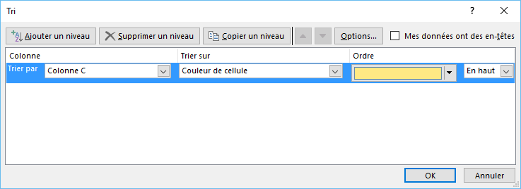 Pour trier les données par couleurs ou par icônes, cliquez sur l'icône Trier et filtrer, puis choisissez Tri personnalisé dans le menu. Sélectionnez une colonne dans la liste déroulante Trier par puis un critère dans la liste déroulante Trier sur. Ici, par exemple, nous allons trier les données par couleur de cellule sur la colonne A. Cliquez sur OK pour trier les données.