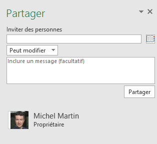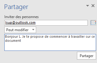 Entrez l’adresse e-mail de la personne avec laquelle vous voulez partager le classeur, indiquez si cette personne pourra modifier ou simplement afficher ce document, entrez un message pour la prévenir du partage et cliquez sur Partager :