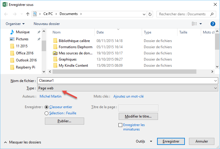 Sélectionnez l'onglet Fichier dans le ruban, puis cliquez sur Enregistrer sous. Double-cliquez sur Ce PC puis choisissez Page web dans la liste déroulante Type, donnez un nom à la page et cliquez sur Enregistrer.