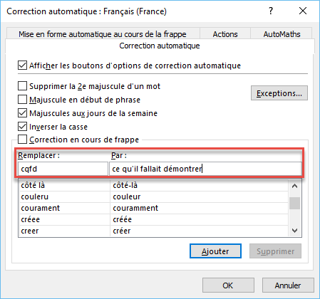 La correction en cours de frappe peut être utilisée pour faciliter la saisie de phrases répétitives, longues et/ou compliquées. Par exemple, si vous tapez cqfd dans la zone Remplacer et ce qu'il fallait démontrer dans la zone Par, le texte cqfd est automatiquement remplacé par ce qu'il fallait démontrer lorsque vous le tapez.