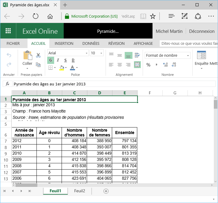 Le classeur s'ouvre dans le navigateur par défaut et peut être librement manipulé via Excel Online. Vous pouvez en particulier modifier des données et des formules, ou encore utiliser une version simplifiée du ruban.