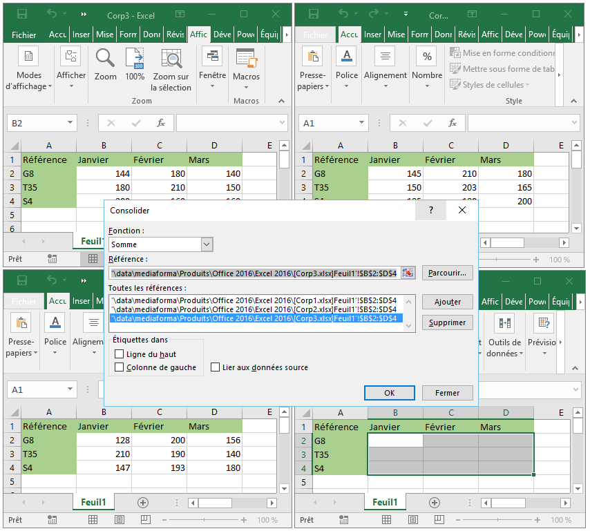 Ouvrez les quatre feuilles de calcul et réorganisez-les pour qu’elles se partagent l’espace de travail d’Excel. Pour ce faire, sélectionnez l’onglet Affichage dans le ruban, cliquez sur Réorganiser tout, sélectionnez Mosaïque et validez en cliquant sur OK.