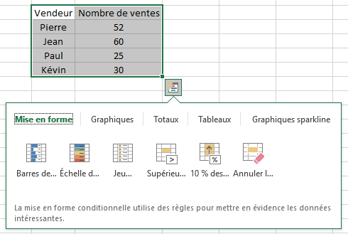 Sélectionnez les données à analyser. Une icône nommée Analyse rapide apparaît en bas et à droite de la sélection. Cliquez sur cette icône pour afficher la barre d'outils Analyse rapide.