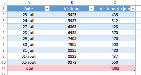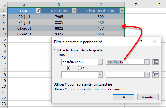 Rien ne vous empêche de filtrer les autres colonnes. A titre d'exemple, pour n'afficher que les lignes dont le champ Date fait référence au mois de Juillet et dont le champ Visiteurs du jour a une valeur supérieure à 500 :
