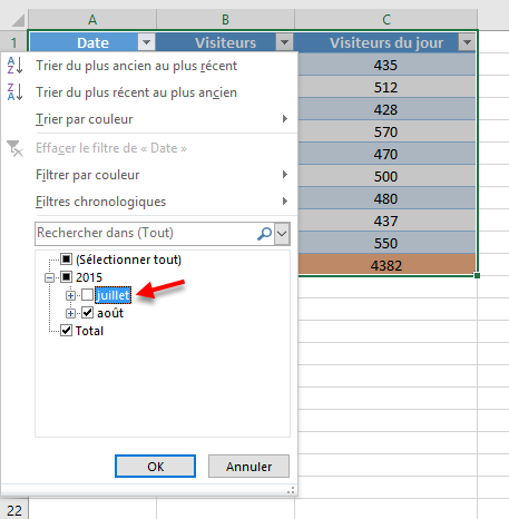 A titre d'exemple, pour limiter l'affichage aux seules données concernant le mois d'Août, cliquez sur la flèche affichée à droite de l'en-tête Date et décochez la case Juillet.