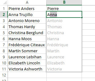 Entrez le prénom Pierre dans la cellule B1. Ce prénom correspond à celui qui se trouve dans la cellule A1. Commencez à taper le prochain prénom dans la cellule B2. Excel remplit automatiquement la cellule courante et les cellules suivantes en isolant les prénoms. Si cela vous convient, appuyez simplement sur la touche Entrée pour accepter la liste.