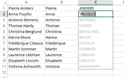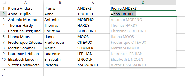 Un autre exemple. Nous allons maintenant conserver les noms de famille et les afficher en majuscules dans la colonne C. Tapez ANDERS dans la cellule C1. Cliquez sur la cellule C2 et commencez à taper le deuxième nom de famille en majuscules. Les cellules suivantes sont automatiquement remplies avec un nom de famille affiché en majuscules.