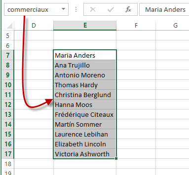 Pour atteindre cette plage de cellules, il vous suffit désormais de taper commerciaux dans la zone Nom (à gauche de la barre de formule) et d’appuyer sur la touche Entrée.