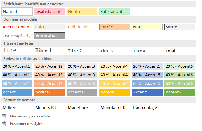 Pour mettre en forme rapidement une plage de cellules, vous pouvez également utiliser la galerie Styles de cellules. Sélectionnez la plage de cellules concernée, cliquez sur Styles de cellules (onglet Accueil, groupe Style) et faites votre choix dans la galerie. Il suffit de pointer un style pour le prévisualiser dans la feuille de calcul, et de cliquer pour l'appliquer à la sélection.