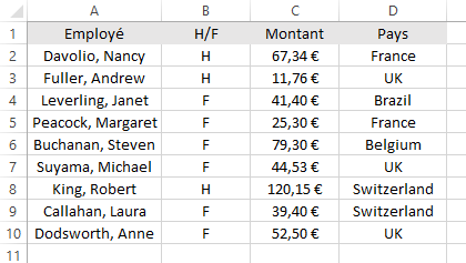 Les Segments (ou Slicers) améliorent les possibilités des tableaux croisés dynamiques et leur offrent une grande flexibilité. Par leur intermédiaire, il est possible de segmenter et de filtrer les données de façon dynamique pour n’afficher que les éléments dont vous avez besoin. Pour illustrer cette fonctionnalité, nous allons utiliser un tableau comportant quatre champs : Employé, H/F, Montant et Pays.
