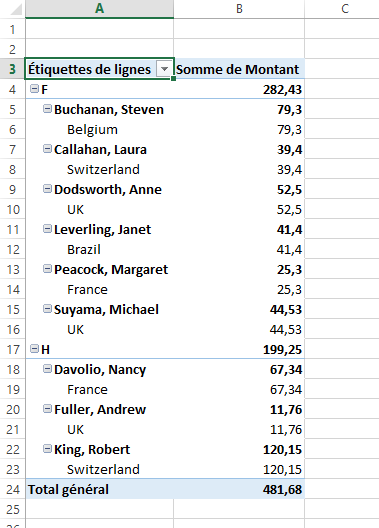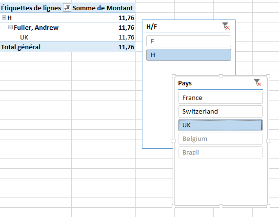 Supposons que vous souhaitiez limiter l’affichage aux hommes vivant au Royaume-Uni. Cliquez sur H puis sur UK. Le tableau croisé dynamique est immédiatement filtré en conséquence.